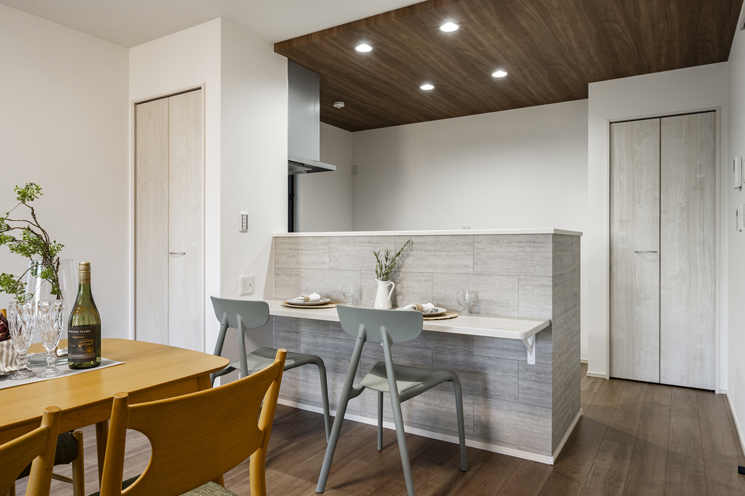 Vol.21食育につながる住まい キッチン前カウンターは、朝ごはんや、おやつなどを食べるスペースとしてご利用いただけます。 対面キッチンで、お子様とコミュニケーションをとることができるため、お子様が食に関心を持ち、食育につながる住まいです。 外観タイプ モダン 所在地 成田市